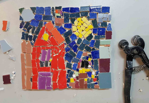 Je mag zelf de tegeltjes kapot slaan en we plakken het mozaïek met echte tegellijm. En dan lekker afsmeren met voegsel.